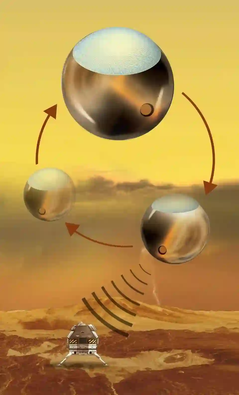 图片展示的金星探测器采用双体结构,可用于执行长期地表勘测任务。双体结构包括一艘悬浮飞船和一颗着陆器,前者从金星大气层收集能量,而后利用无线传输技术,将能量传输给地表的着陆器。这项技术能够让着陆器获得源源不断的能量,进而长期执行地表勘测任务。