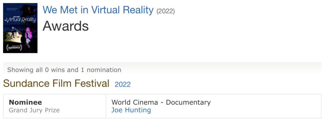不负盛名,「我们在虚拟现实中相遇」还获得了本届圣丹斯电影节评审团大奖(Grand Jury Prize)的提名。