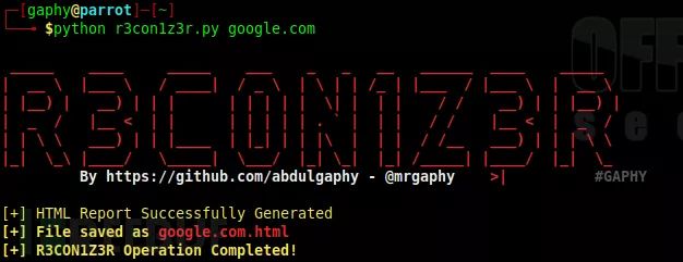 $ git clone https://github.com/abdulgaphy/r3con1z3r.git$ cd r3con1z3r$ pip install -r requirements.txt