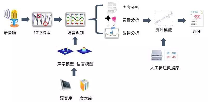 口语测评一般包括两个环节,首先通过语音识别对用户的录音进行分析,提取一些声学和韵律等各方面的特征,然后再通过训练好的测评模型估计用户的评分。