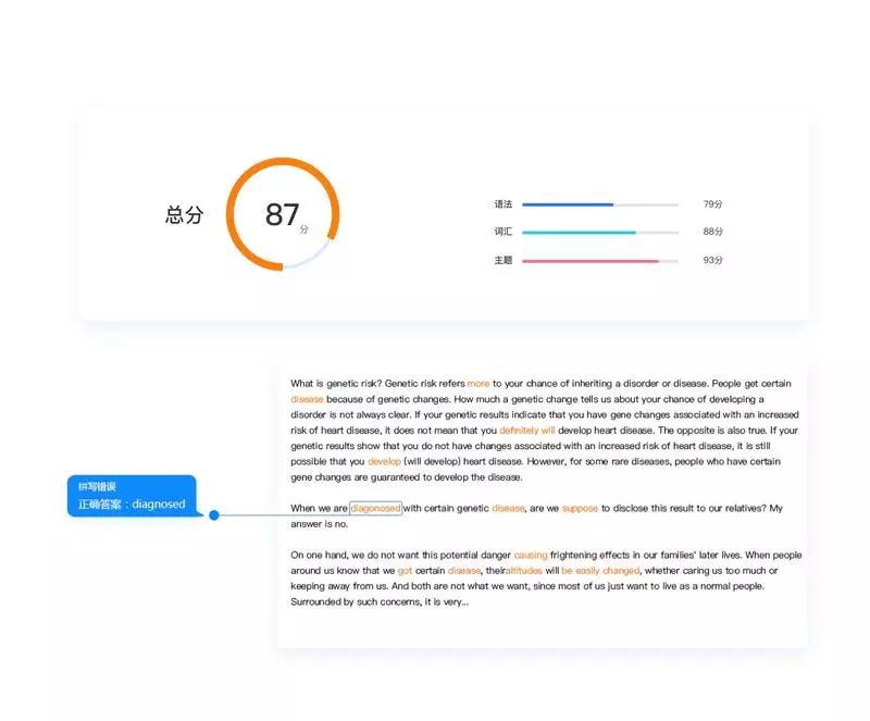 “我们既提供整个句子或者是篇章的总体打分,同时也提供包括完整度、流利度、准确度在内的每个维度的分数。我们还会反馈小到音素级别的音素发音分、音素检错信息,单词发音分、单词重音检错,句子语调、语速、停顿、重复、遗留单词等信息。”