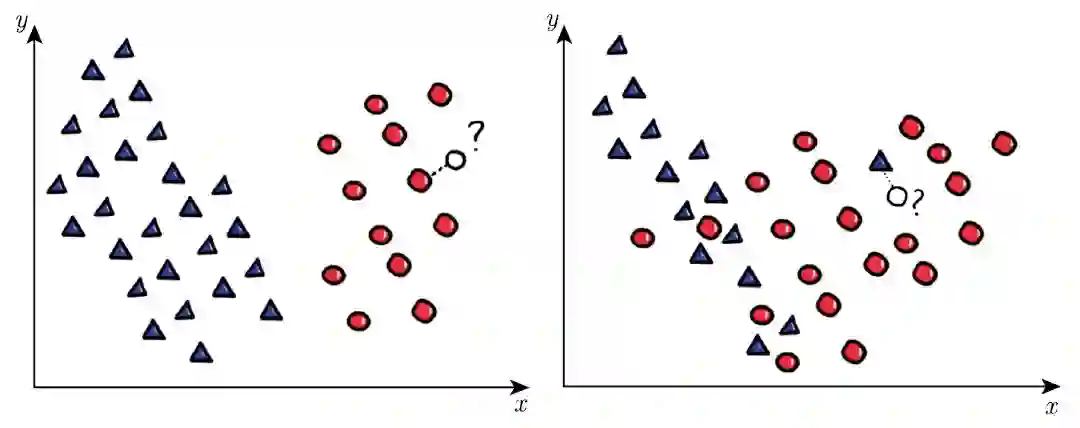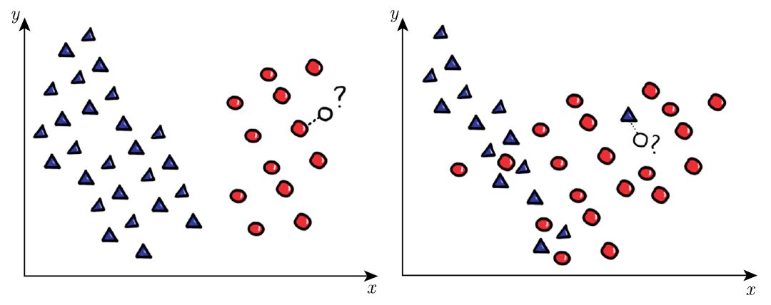 图 3 最近邻分类:一个清晰的情形(左),一个不太清晰的情形(右)。在第二种情形中,标有问号的查询点的最近的邻居属于负类,但它的更多近邻属于正类
