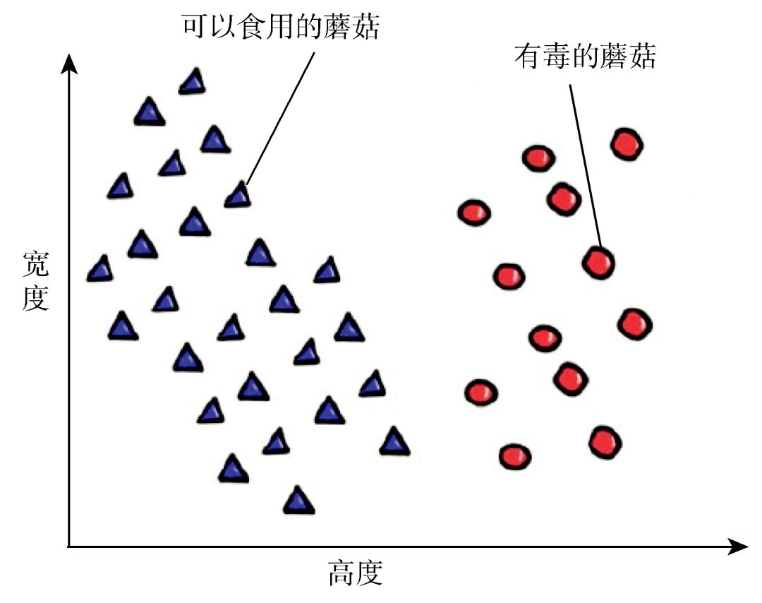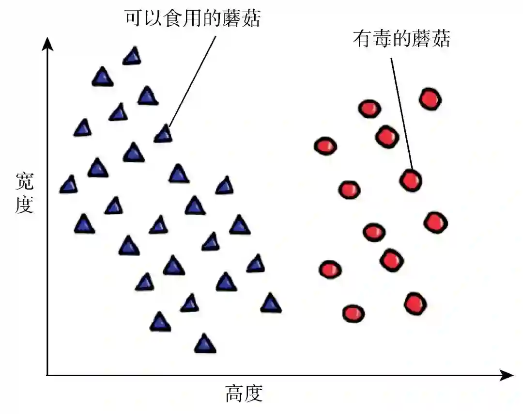 图 2 简化的例子:两个特征(宽度和高度)用以区分可以食用的和有毒的蘑菇