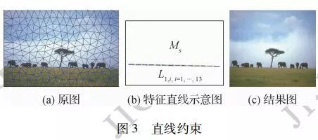 然后,以图像直线特征保持为约束,构造用于约束弹簧系统变形的目标函数;