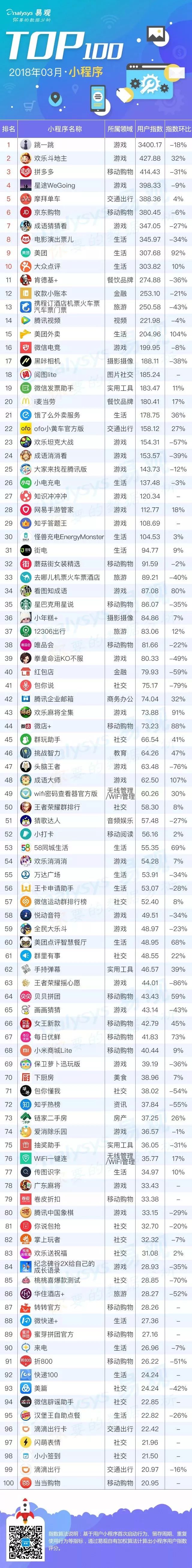2018年3月小程序 TOP100榜单