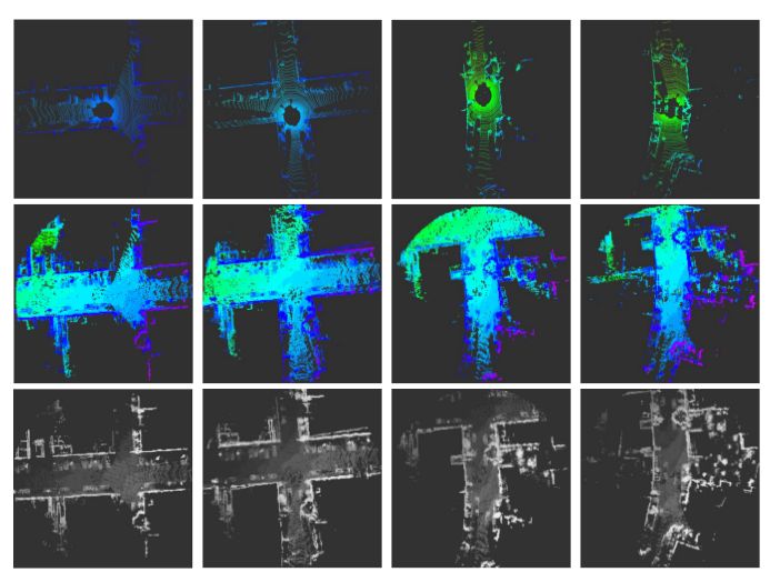 图2 动态八叉树建图结果的示例。第一行显示原始点云数据; 第二行显示基于所提出的动态八叉树建图的累积占用图; 第三行显示投影的鸟瞰2D地图。