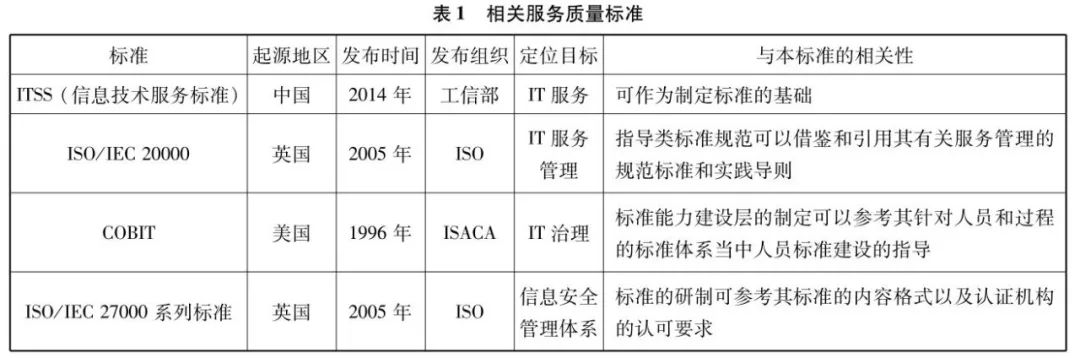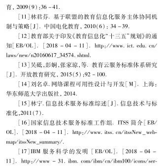 然而,目前研究教育信息化服务方面的专有标准规范还比较少,国内外可供借鉴与引用的标准主要有4项,国内1项,国外3项,不过这些标准主要是关于信息技术服务质量方面的,详见表1。