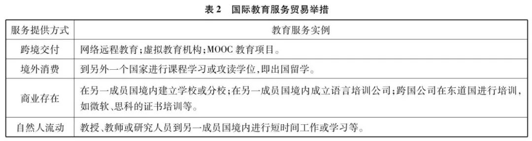 WTO服务贸易,是以服务为主体的贸易。国际服务贸易是以国境为界划分的,当服务作为商业行为跨越国境时,国际服务贸易随之发生[22]。WTO服务贸易定义了服务的类型与承诺方式,并在《服务贸易总协定》当中规定了服务贸易的范围、一般义务以及其他一些约定,并对各行业服务贸易的发展、管制、实施提供了指导规则和条例。WTO《服务贸易总协定》将服务贸易分为四个方面[21]:(1)自一成员境内向其它成员境内提供服务;(2)在一成员境内对其它成员之消费者提供服务;(3)由一成员之服务提供者以设立商业据点方式在其它成员境内提供服务;(4)由一成员之服务提供者以自然人的呈现方式在其它成员境内提供服务。国际服务贸易的提供方式主要包括:跨境交付、境外消费、商业存在、自然人流动四种[21]。