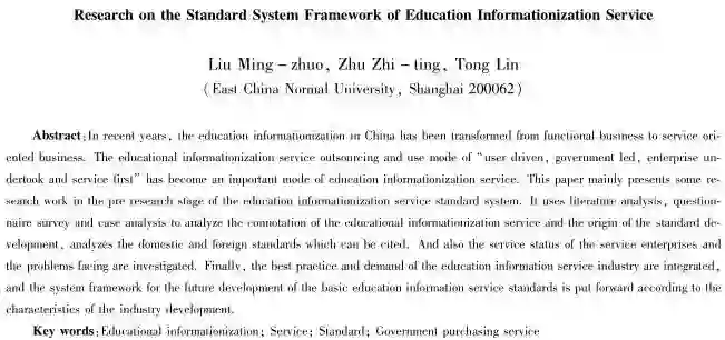 近几年,我国教育信息化呈现出由功能驱动型向服务驱动型转化的特征,“用户驱动、政府主导、企业承包、服务至上”的教育信息化服务外包与使用模式已成为教育信息化服务的重要模式。在教育信息化服务标准体系预研阶段的一些研究工作中,综合运用了文献分析、问卷调查和案例分析法,主要针对教育信息化服务的概念内涵、标准研制缘由进行了深度剖析;分析了可参引的国内外标准,针对教育信息化服务企业的服务现状与面临的问题困境进行了调查研究,最后依照教育信息化服务行业的发展特点整合典型的服务实践案例,面向该行业的未来发展趋势,提出了基础教育信息化服务标准研制的体系框架,并对该框架内容进行了阐述。