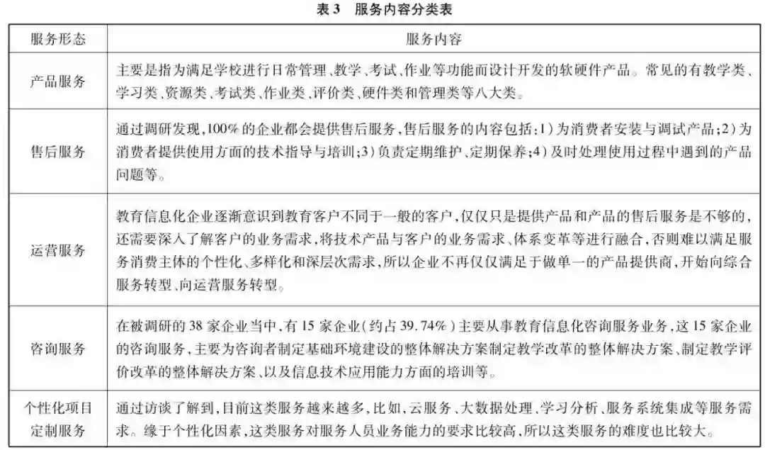 (2)服务的形态有很多种,具体可划分为产品服务、售后服务、运营服务、咨询服务和个性化项目定制服务五大类,详见表3。