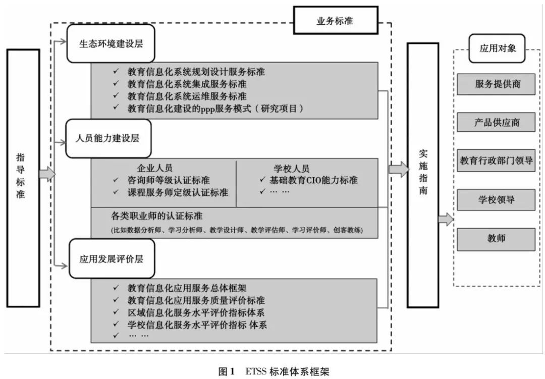 在此背景下,教育信息化服务标准(Education Technology Service Standards,简称ETSS)应运而生。该标准是在全国信息技术标准化技术委员会教育信息化技术标准委员会的指导下,由教育信息化服务标准工作组(ETSS工作组)组织研究制定,采用“政产学研用”联合推进的研制路线,由华东师范大学牵头,业内资深企业、电教馆、示范学校等共同参与研制。该套标准的应用范围主要涉及教育信息化服务提供商、产品供应商、教育行政部门、学校、教师等。