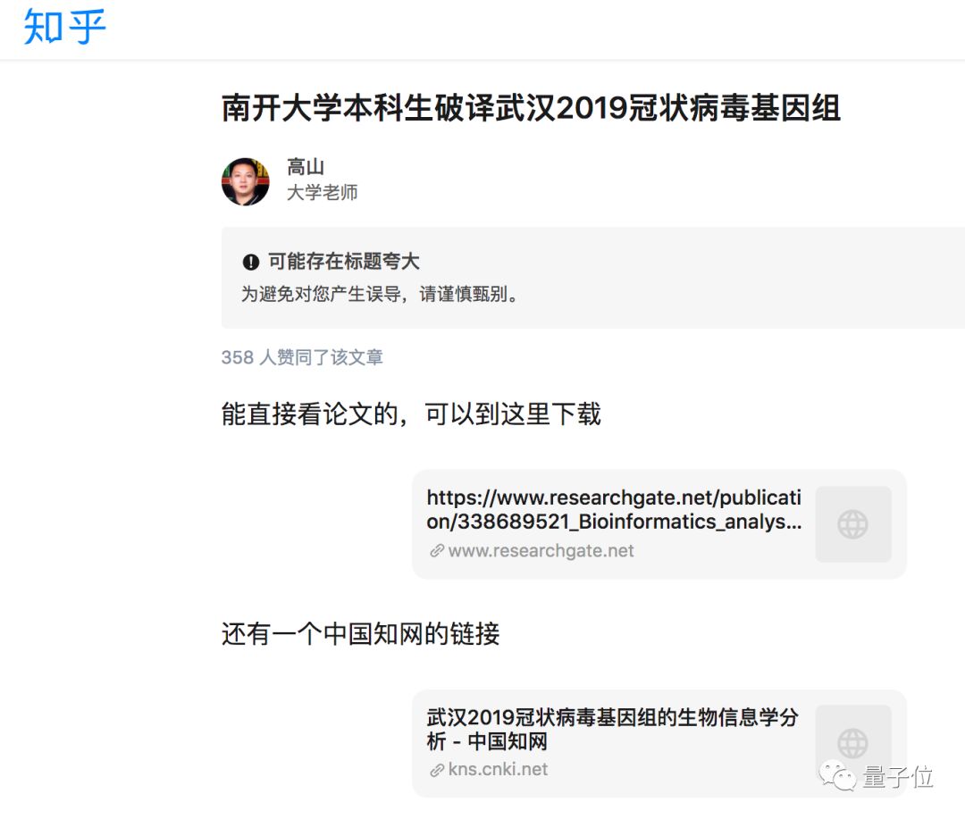 首先是这篇知乎上热议的专栏文章,称“南开本科生破译武汉2019冠状病毒基因组”。
