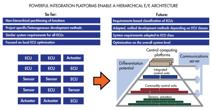 今天,主流的构架是以功能划分的逻辑域,但是,逻辑域的功能高度分散在不同的物理控制器中,结果是构架非常复杂,在整合、测试以及可扩展性方面面临很大挑战。PDC的出现将外部执行单元与计算隔离,是典型的中央计算机+区控制的实现案例。