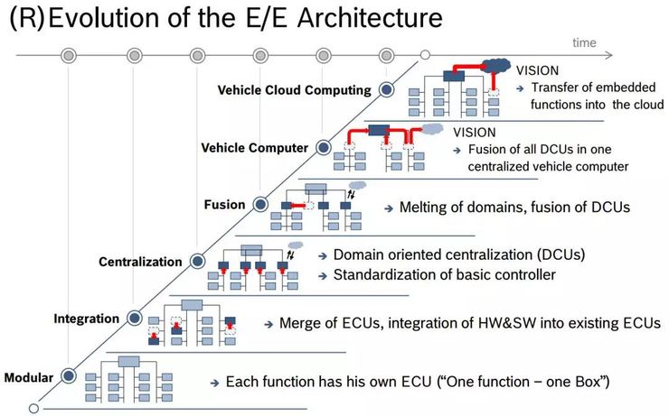 博世的渐进式路线从域的集中化开始演进,终极目标一样是车载中央计算机,并且进一步扩展了与云端配合的分布式计算能力。大陆的发展路径也和博世非常类似。