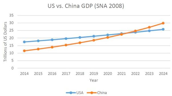 2018 年中美“贸易战”,美国的媒体为了向美国老百姓说明中国经济发展的情况,特别是对美国经济的威胁,一定要使用到中国经济和美国经济相关数字。那么,你觉得这些数字怎么展示?