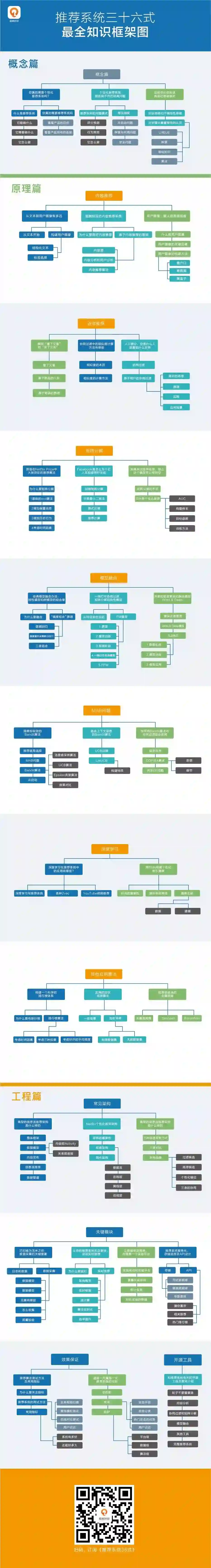 这张长图,凝聚了极客时间 App《推荐系统 36 式》专栏的核心要点,从概念到模型,从深度学习到算法,从架构到开源工具等等,全方面覆盖了搭建一个推荐系统的所有知识点。