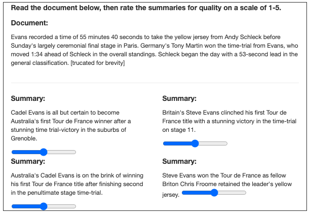 虽然使用像 ROUGE 这样的自动度量标准在模型开发过程中作为度量标准有用,但是该标准提供的信息有限,比如无法获悉文本摘要的流畅性或者与人类性能相比较结果如何。为此,本文还进行了一次人工评估,要求评分者将文本的模型摘要结果与人工摘要进行比较(不知道哪个是哪个)。这与图灵测试有一些相似之处。
