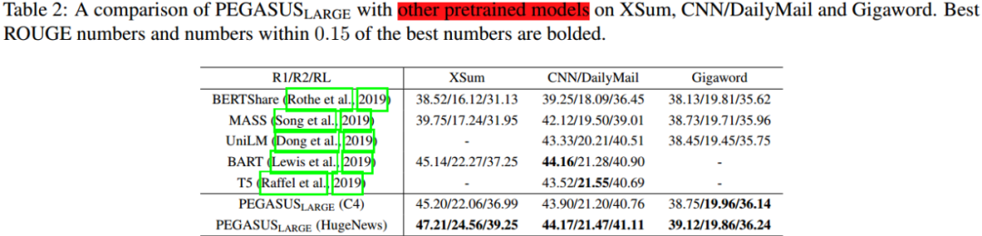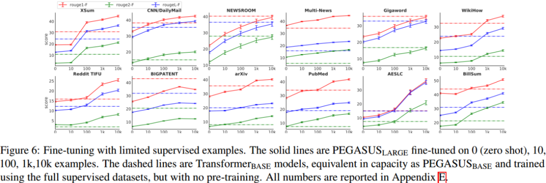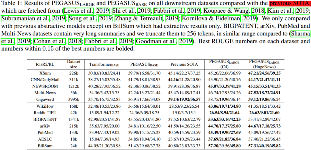本文以 12 个文本摘要数据集(包括新闻、科学、故事、使用说明、电子邮件、专利和立法议案)对最好的 PEGASUS 模型进行全面测试。实验结果是:PEGASUS 刷新 12 个数据集的 ROUGE 得分记录。另外,PEGASUS 模型在处理低资源摘要数据集也显示出惊人的性能,在 6 个数据集上仅以 1000 个样本就超过了之前的最先进结果。最后,本文还对 PEGASUS 模型生成的摘要结果进行人工评测,结果表明本文的模型在多个数据集上达到与人工摘要相媲美的性能。