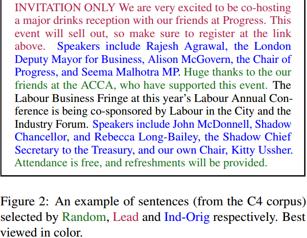 实验发现,选择重要的句子来遮蔽效果最好,让自监督示例的输出结果更像摘要。那么怎么选择重要的句子?根据 ROUGE 度量标准,通过查找那些与文档的其他部分最相似的句子,自动地识别出这些句子。ROUGE 计算两个文本的 n-gram 重叠,从而得到文本之间的相似性(ROUGE-1、ROUGE-2 和 ROUGE-L 是三种常见的变体)。句子选择策略如 Figure 2 所示: