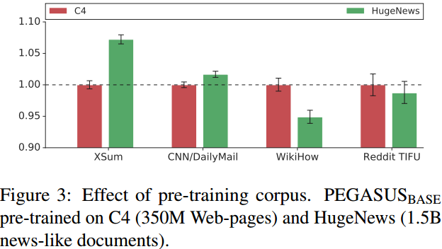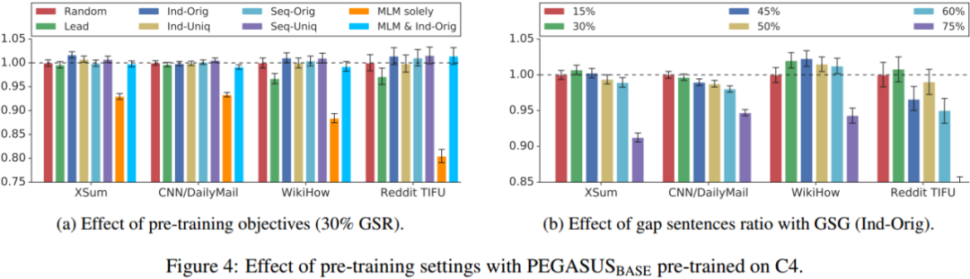 Figure 4a 可以看出 Ind-Orig 的方案最佳,Seq-Uniq 次之。Figure 4a 展示了 gap-sentences 比例(GSR)的影响。实验表明 GSR 低于 50% 较好,在 CNN/DailyMail 数据集上 15% 的比例可以得到最优结果。而 XSum/Reddit TIFU 和 WikiHow 的最佳值分别是 30% 和 45%。