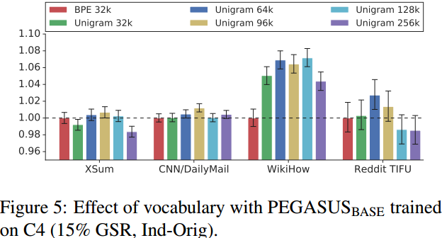 基于之前的实验,在 Large 版的模型中选用的是 GSG(Ind-Orig)预训练目标(不带有MLM)、Unigram 词典大小 96k。