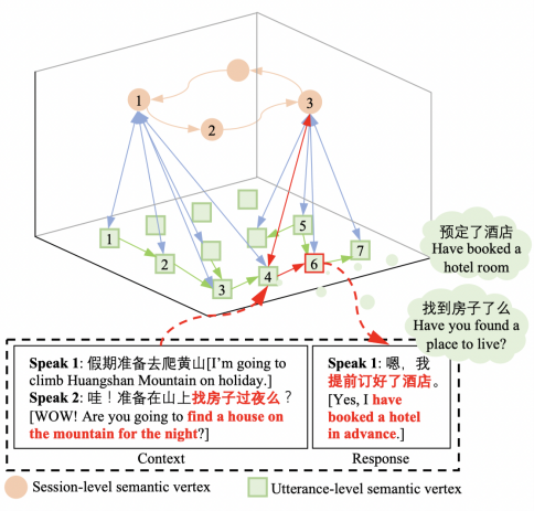 如图1所示,对话结构图有两类节点,分别是位于上层的捕捉了多轮会话级语义的会话级节点(图中橙色圆形节点),和位于下层的捕捉了话轮级语义的话轮级节点(图中绿色的方形节点)。进一步的,对话结构图有三类边,分别是连接连接两个会话级节点的Sess-Sess边、连接两个话轮级节点的Utter-Utter边以及连接一个会话级节点和一个话轮级节点的Sess-Utter边。