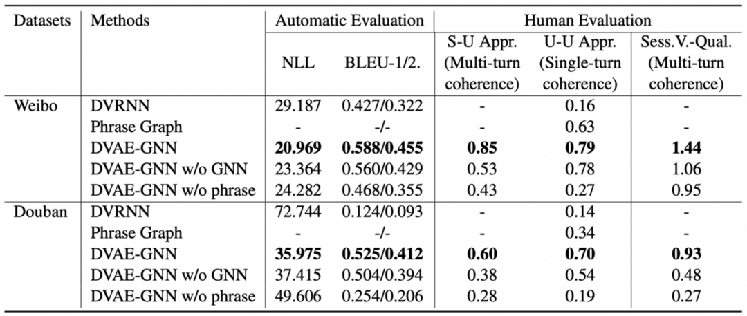 如表1所示,DVAE-GNN在两个数据集上的所有评估指标(显著性检验,p<0.01)上都显著优于基线DVRNN。这表明了DVAE-GNN模型能够更好地发现有意义的对话图。具体而言,DVAE-GNN在NLL和BLEU-1/2方面取得了最好的结果,表明了DVAE-GNN比DVRNN能够更好地捕获重要的语义信息。同时,DVAE-GNN在"U-U Appr"和"S-U Appr"指标上也超过了所有基线。结果表明,本文发现的对话图中的边具有较高的质量,能够更好地促进对话生成的多轮连贯性。