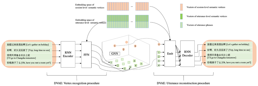 如图3所示,DVAE-GNN模型主要包括两个子过程:节点识别(vertex recognition)子过程和对话重构( utterance reconstruction )子过程。其中节点识别子过程将多轮对话映射到图中,对话重构子过程基于映射到的节点来重构多轮对话句。直观地,为了更好的重构对话句,节点识别子过程应该尽可能的实现精准映射。