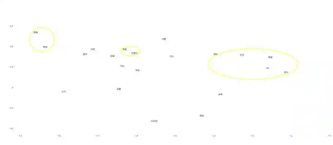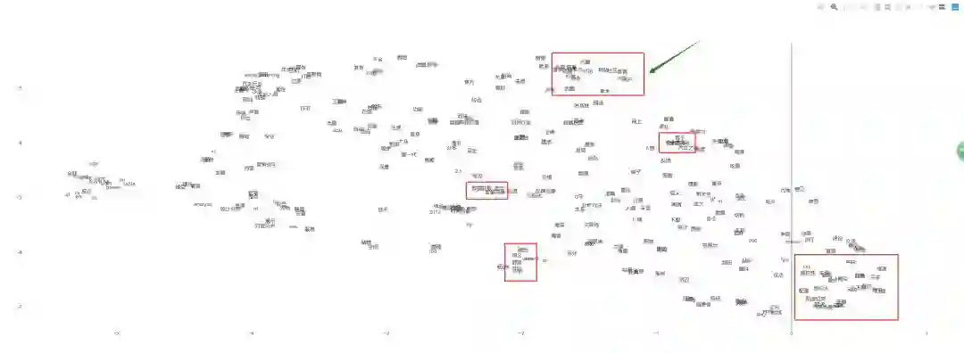 通过使用t-SNE,可以将词汇向量的维度降低到2维,从而将高维的词嵌入结果进行可视化呈现。