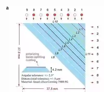 图1:多光子玻色子采样的实验装置示意图。该设置包括4大关键部分:单光子源、多路复解析器(demulitplexer)、超低损耗光子测量阵列和光子探测器。脉冲皮秒激光泵浦InAs/GaAs量子点,产生单光子源和一个直径 2μm 的微柱腔进行耦合,共振时产生 7.63(23) 的 Purcell 因子。一个共焦显微镜以交叉极化配置(cross polarization configuration)工作,消除激光背景。单模光纤用来收集共振荧光单光子,然后导入多路复解器,后者由 Pocke盒和偏振分束器组成,四组这样的模块将光子分为5个空间模式,经过特定的光纤延时后,光子被注入到低损耗测量阵列进行波色采样实验,光子检测阵列由五个输入九个输出端口组成,中间是由 36个分束器和反射镜组成。9个单光子检测器会测量干涉仪的输出,时间-数字转换器(TDC)用来分析多光子的符合。
