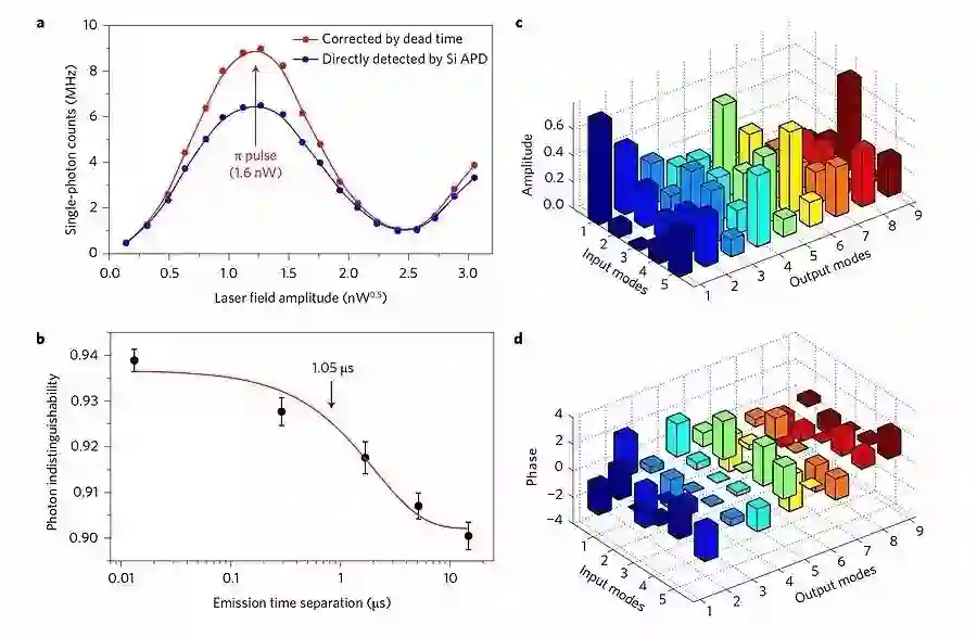 图2:用于玻色子采样的单光子源和干涉仪示意图。a,通过量子点的脉冲共振激发观察到的 Rabi 振荡。蓝色点表示由硅检测器直接测量到的单光子数,红色点表示通过检测 dead time 校正后的计数。单光子计数在 π 脉冲功率下达到最大值 1.6 nW。 b,在非马尔科夫噪声模型的前提下,测量的光子不可区分性(indistinguishability)在 13ns 处略有下降,在 >10μs 分离的情况下从 0.939(3) 下降为 0.900(3),此后一直保持平稳,衰减时间常数是 2.1μs。蓝色箭头表示我们当前工作中的状态,其中两个光子由于解复用而被最大程度地分离了 1.05μs 的时间。误差条(error bar)表示一个标准差,这个标准差是从原始光子检测事件的传播泊松计数统计(propagated Poissonian counting statistics)得出的。c,d,表示测量到的光网络酉变换(unitary transformation)数值(c 是幅度,d是相位)。