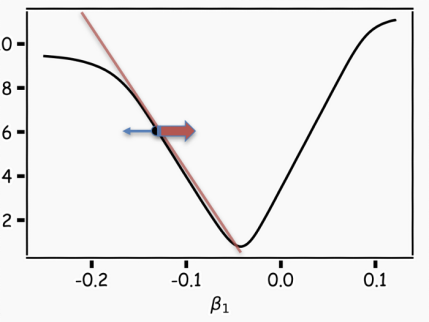 一个更灵活的方法是选择任意一个起点,并确定在哪一个方向上减少损失(当前情况下是选择向左还是向右)。具体来说,我们可以计算出函数在这一点上的斜率。如果斜率为负,则向右移动;如果斜率为正,则向左移动。然后重复此过程,直到收敛。