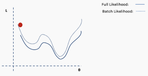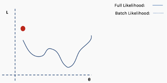 这是完整损失函数的近似值。我们可以用一个例子来说明这一点。首先,我们从完整损失(似然)函数曲面开始,随机分配的网络权重为我们提供初始值。