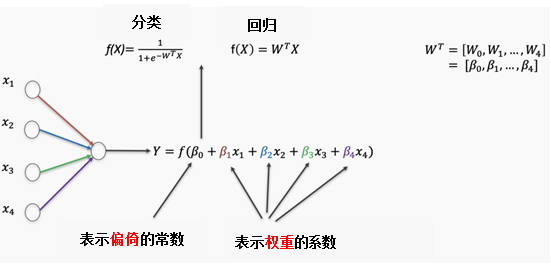 我们在刚刚的模型中仅使用了一个特征,在神经网络中,我们可以使用多个特征。对于每一个特征都可以设置权重和误差项,这两部分结合起来就是回归参数。根据预测结果是连续变量或分类变量,公式可能略有差异。