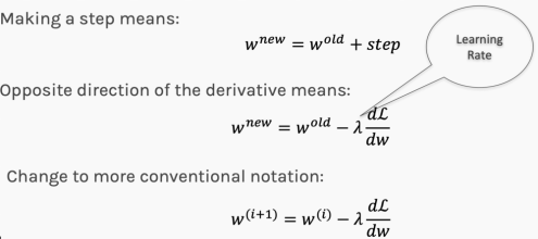 我们知道要朝着导数的相反方向前进(因为我们正试图“远离”误差),并且希望步长与导数成比例。步长由一个称为学习速率的参数λ控制。我们的新权重是旧权重和新步长相加之和,其中步长是从损失函数派生出来的,这就表明相关参数在影响学习率方面有多重要(因此是导数)。