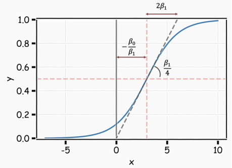 注意,如果β1是正数, P(y=1)预测值随着X取值由小到大而从0到1变化,如果β1是负数,二者关系则相反。