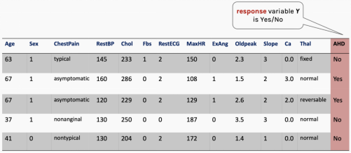 如我们可能会根据病人的特征预测其是否有心脏病。这里的响应变量是分类变量的,只有有限个结局,更明确的说,只有两个结局,因为响应变量是二分类的(是/否)。