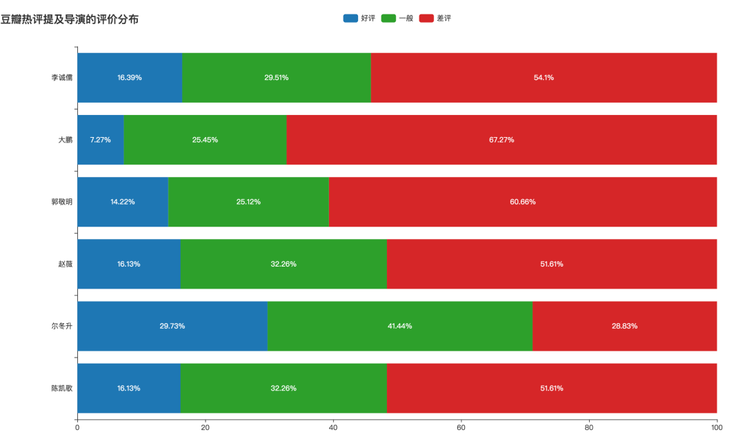在对导演和主持嘉宾的评价也十分有意思,对郭敬明的差评达到60.66%,超过的半数,好评仅为14.22%。这与尔冬升的评价差距很大,后者的差评仅为28.83%,好评度也是最高的,达到了29.73%。而有趣的是,作为主持人的大鹏差评度居然比郭敬明还高,达到了67.27%。