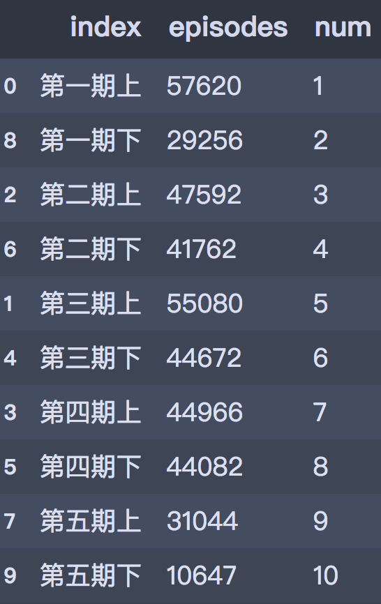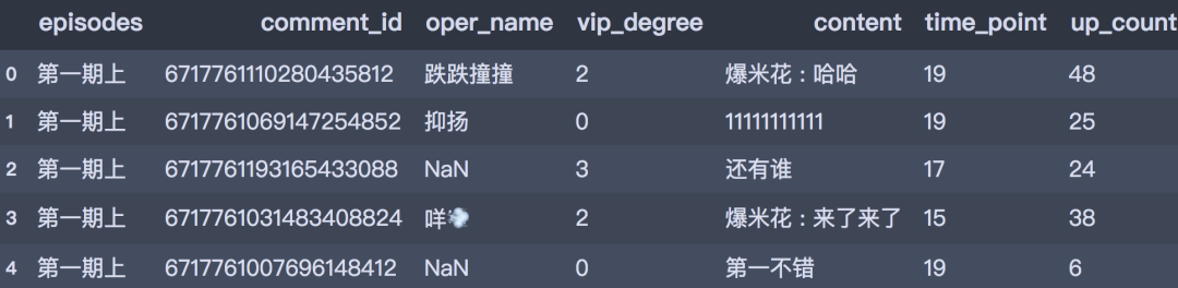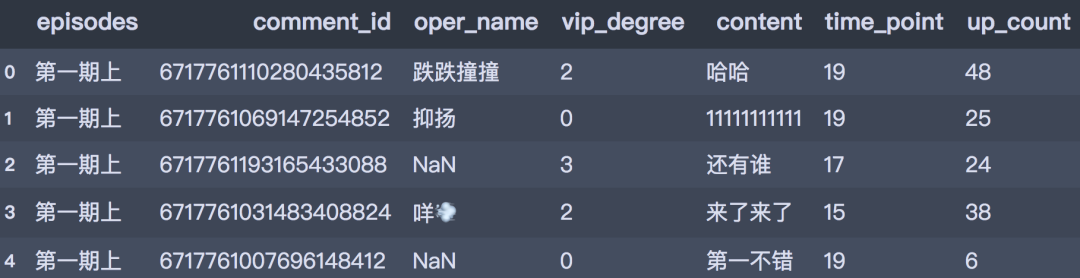 共获取了前五期449762条弹幕数据。字段主要包括:期数、评论id、用户名、vip等级、评论内容、评论时间点和点赞数,数据预览如下: