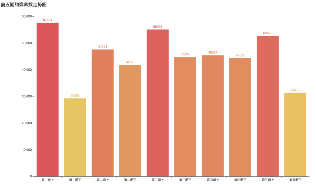 先看到视频弹幕走势图,从数量上可以看到,弹幕数量前三的分别是:第一期上、第三期上、第五期上。而第一期下和第五期下的弹幕较少。