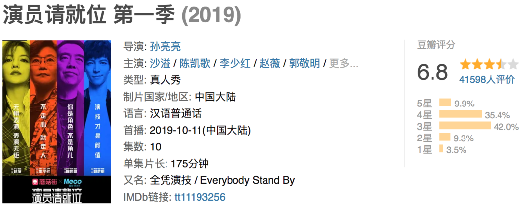 《演员请就位》目前为止已经播出了两季,第一季在豆瓣为6.8分,共有4万余人评分。