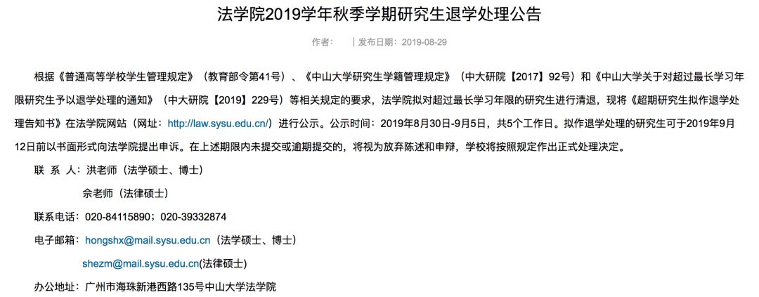 今天(8月30日),中山大学法学院在官网上发布关于《法学院2019学年秋季学期研究生退学处理公告》。拟退学处理的研究生共有53人,其中超期博士7人,超期法律硕士44人,超期学术型硕士2人。退学的原因主要是上述研究生超过了学习年限。