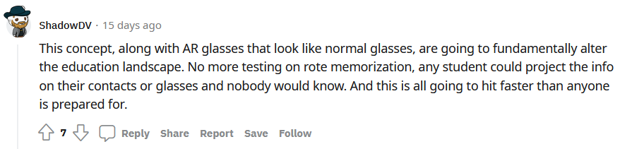还有人在恶搞未来的用途:「这个概念,加上与普通眼镜外观相同的AR眼镜,将会根本性改变教育业的未来。基于重复记忆的考试行不通了,任何学生都可以把答案投射在镜片上,而没人会发觉。此未来的到来将比所有人预料中的更快。」