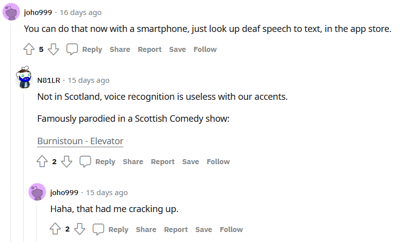 楼主回复:「额们苏格兰人的口音,一直能打败大部分语音识别AI。这哏已经上电视咧。」