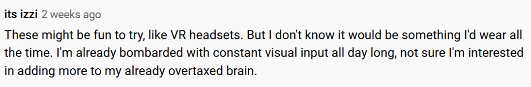 有人持温和的保留意见:「这产品看上去和VR头套差不多好玩,但不希望这成为自己整天佩戴的设备。我整天已经被持续不断的视觉讯号输入轰炸,不确定是否会给自己已经疲惫不堪的脑子加负担。」