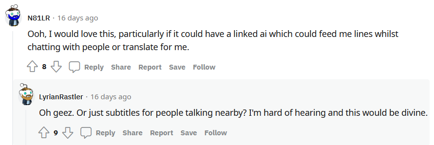 「赞同,我听觉不是很好,要是这镜片能实时弹出他人对话字幕,那可美死了。」