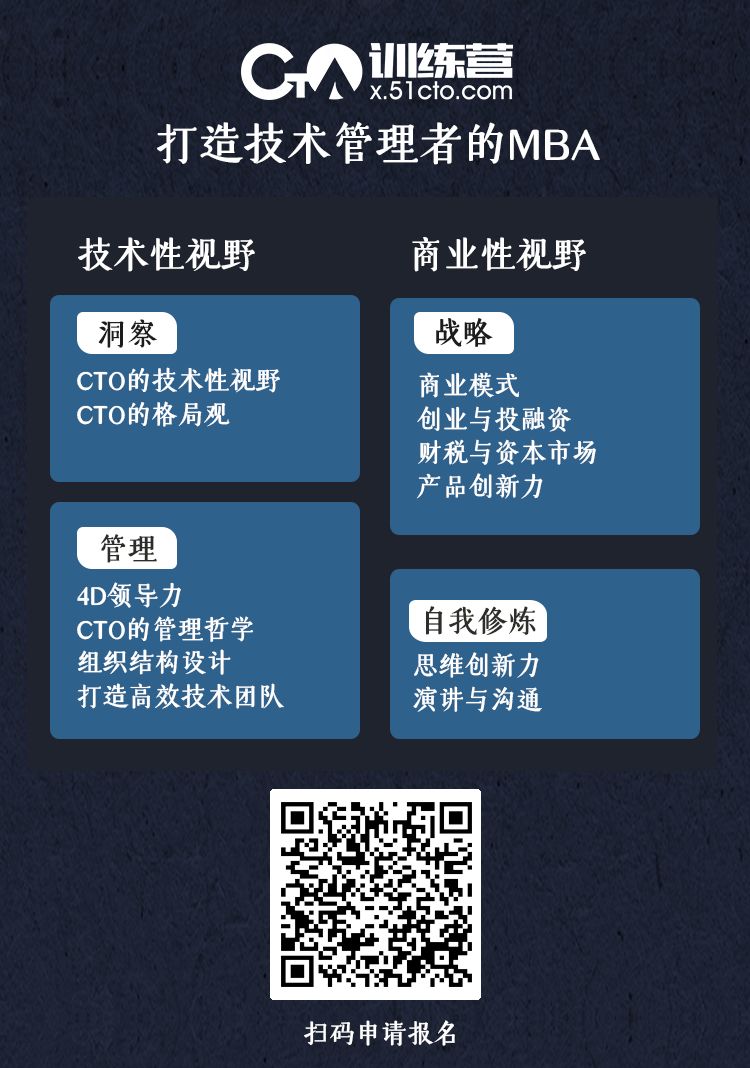2019年,CTO训练营继续启动技术管理者培养计划——CTO训练营第六季,360技术总裁谭晓生、国美零售副总裁于斌平、元航资本创始合伙人张志勇、微众银行副行长兼CIO马智涛等50+行业导师经验淬炼,以及前五季毕业的500+CTO校友倾情推荐,如果你致力于成为优秀的技术管理者,邀请你重点关注: