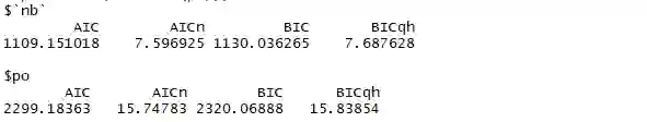 list(nb=unlist(modelfit(nb)),po=unlist(modelfit(po)))
