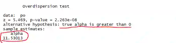 首先检查数据是否过度离散,先进行泊松回归,然后使用dispersiontest函数对泊松回归结果进行检测,看alpha是否大于0,注意需设置dispersiontest函数中的trafo=1,否则认为alpha大于1过离散。