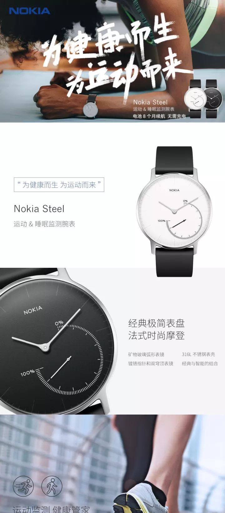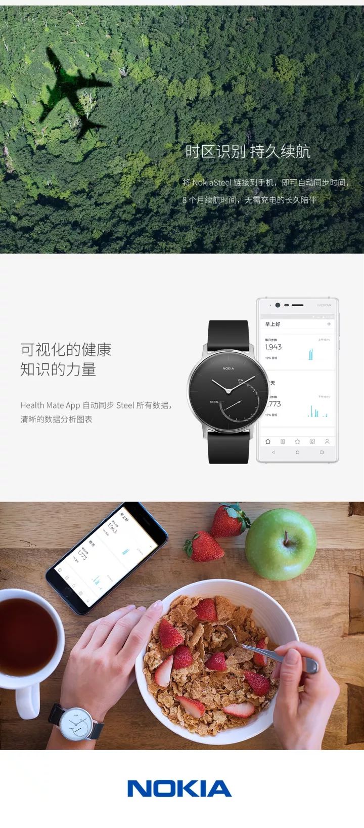 Nokia Steel是一块运动&睡眠监测智能手表,它跳出人们对大多数智能手表的外观认知,回归腕表的设计感,产品设计弱化运动感,是一款外观时尚、适合各种场合佩戴的智能手表,具备潮流属性,时尚、运动、商务服饰均可搭配。目前售价1488元。即日起至11月6号,天猫京东同步促销,仅需1158元~